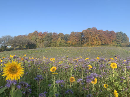 Aktuell finden Sie in unserem Blütennmeer: Öllein (Leinsamen), Phacelia, Ramtillkraut, Sonnenblumen, Michelsklee, Bitterlupine und Sommerwicke