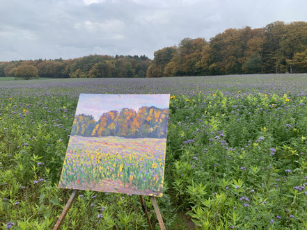 Das Blütenmeer verändert sich im Laufe der Vegetation. Zu Beginn blühen hauptsächlich Phacelia und Öllein. Die Sonnenblumen blühen erst später.
